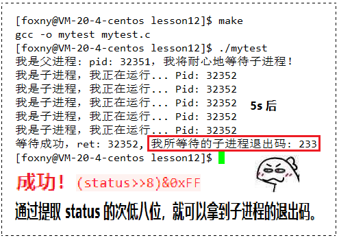 💬 验证: 通过提取 status 的次低八位,可以拿到子进程的退出码。