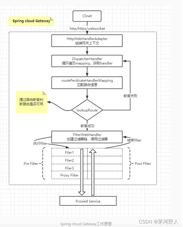 Gateway 接收客户端请求。客户端请求与路由信息进行匹配,匹配成功的才能够被发往相应的下游服务。请求经过 Filter 过滤器链,执行 pre 处理逻辑,如修改请求头信息等。请求被转发至下游服务并返回响应。响应经过 Filter 过滤器链,执行 post 处理逻辑。向客户端响应应答。
