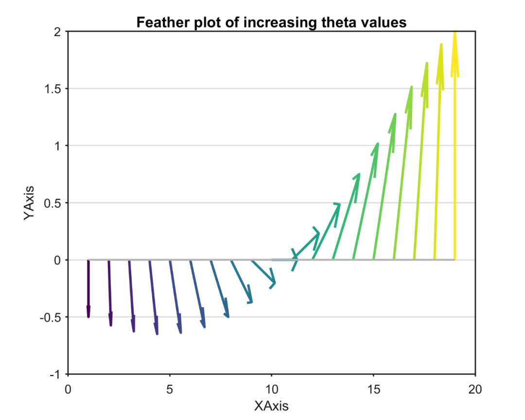 f1 = feather(U,V);hTitle = title('Feather plot of increasing theta values');hXLabel = xlabel('XAxis');hYLabel = ylabel('YAxis');