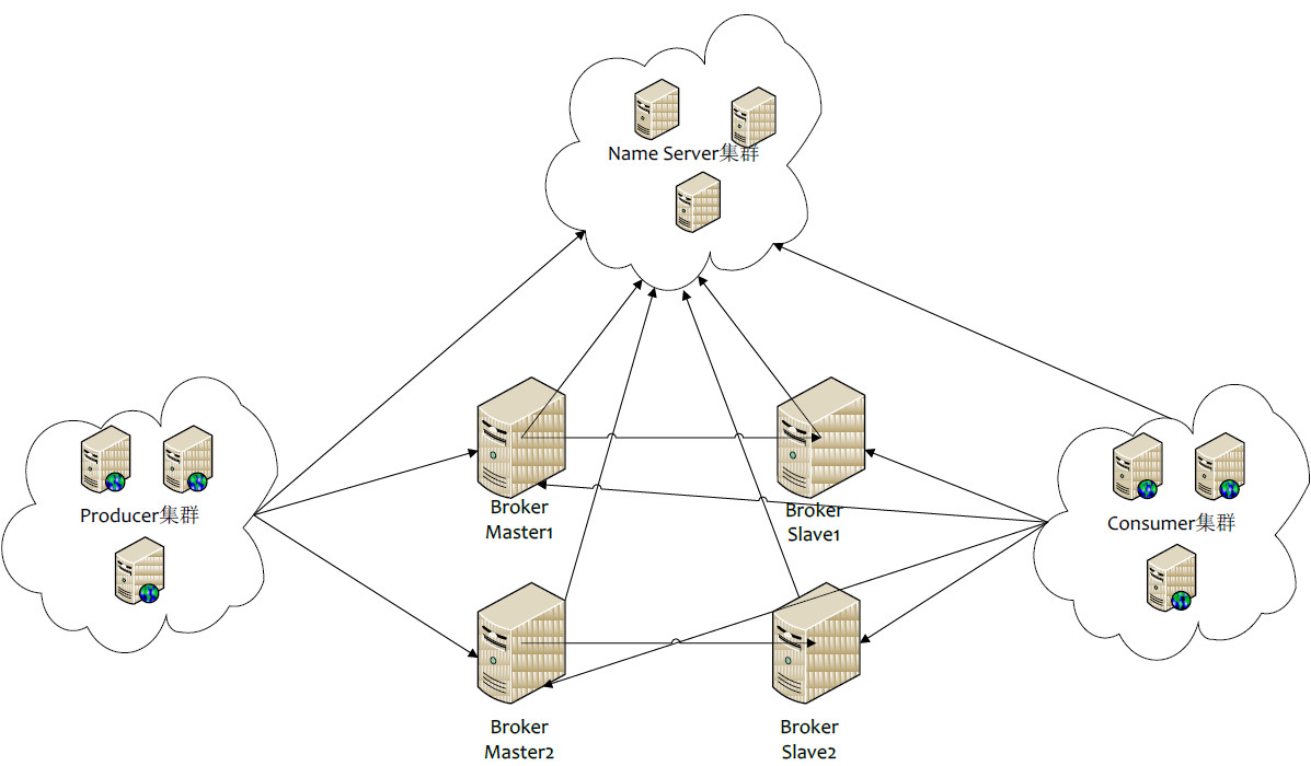 Broker部署相对复杂,Broker分为Master与Slave,一个Master可以对应多个Slave,但是一个Slave只能对应一个Master,Master与Slave的对应关系通过指定相同的BrokerName,不同的BrokerId来定义,BrokerId为0表示Master,非0表示Slave。Master也可以部署多个。每个Broker与NameServer集群中的所有节点建立长连接,定时注册Topic信息到所有NameServer。