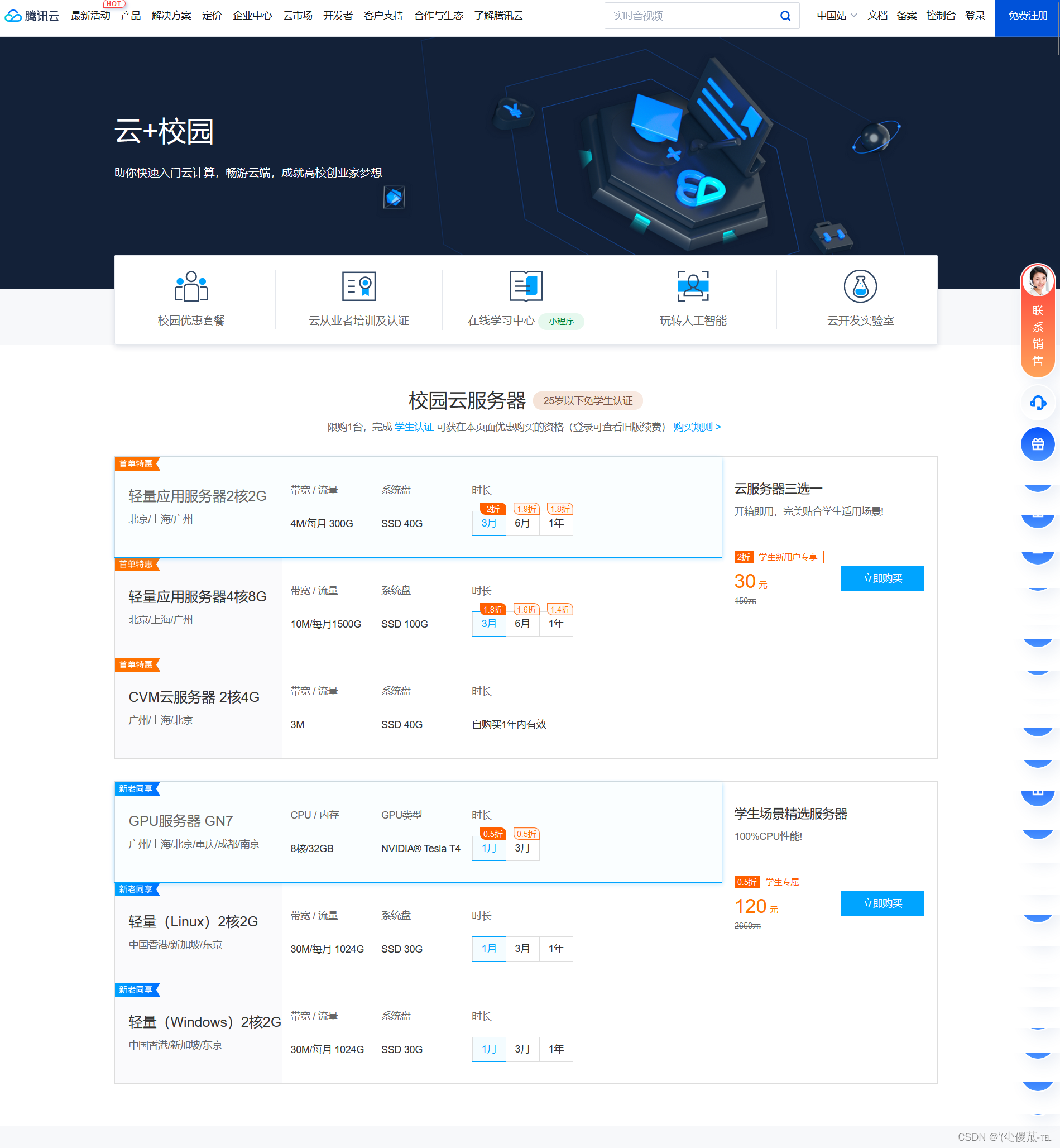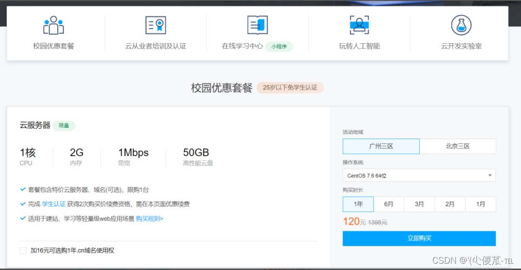 右侧的操作系统选择 CentOS 7.6 64位. 购买时长根据需要选择(建议1年), 点击立即购买即可.