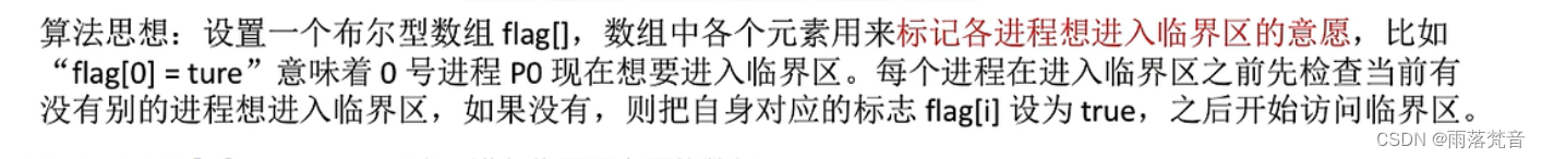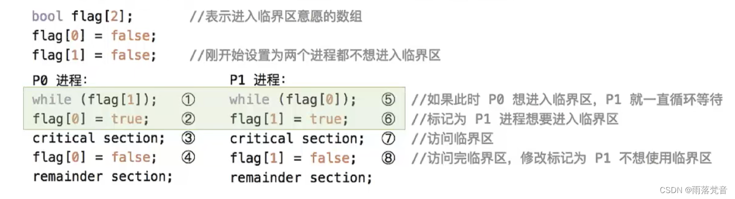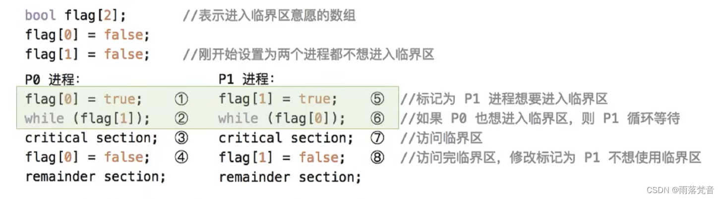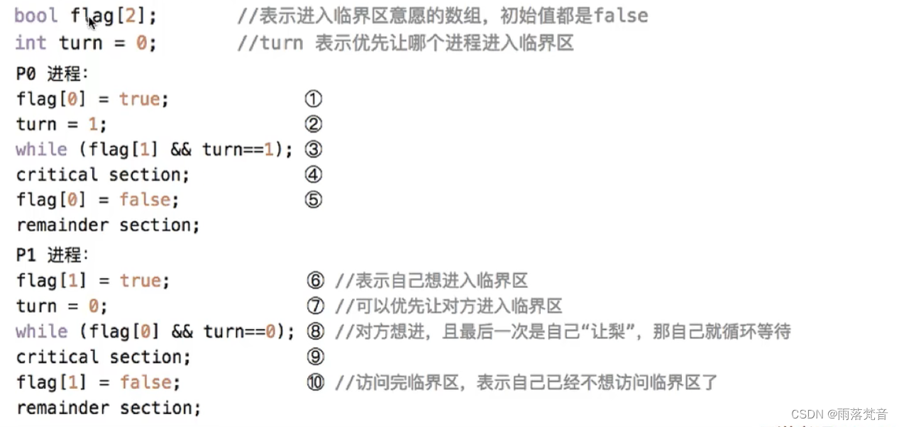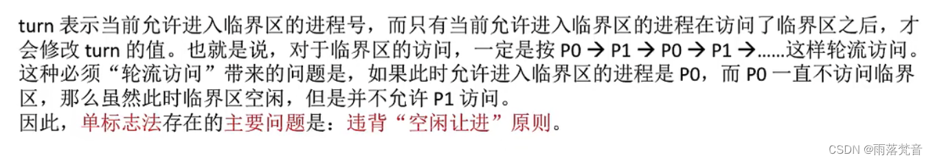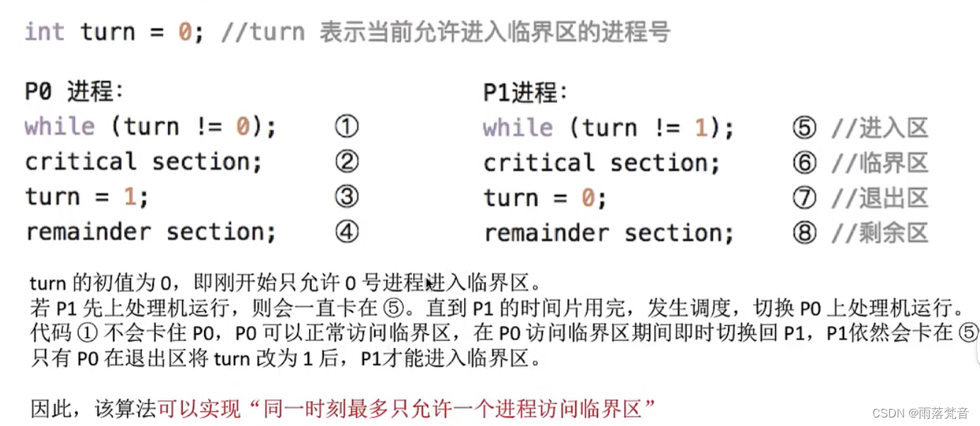 算法思想:两个进程在访问完临界区后会把使用临界区的权限转交给另一个进程。也就是说每个进程进入临界区的权限只能被另一个进程赋予