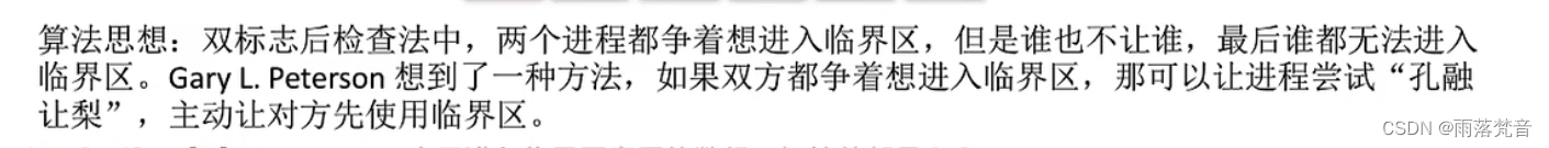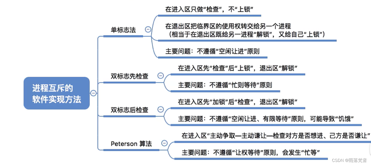 Peterson算法用软件方法解决了进程互斥问题,遵循了空闲让进、忙则等待、有限等待三个原则,但是依然未遵循让权等待的原则。