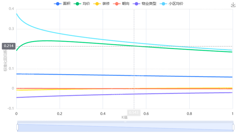 由于地区均价,小区均价等与房屋面积之间存在较强的共线性,于是暂时选取岭回归模型进行定价。