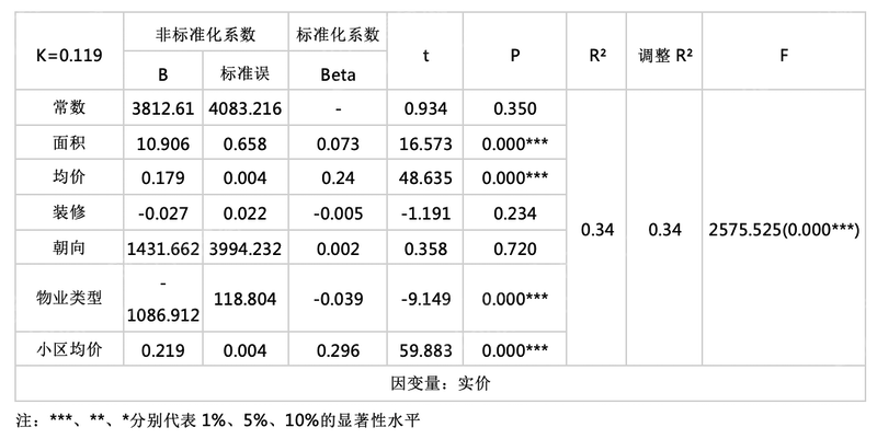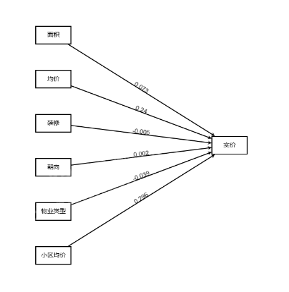 实价=3812.61+10.906 × 面积+0.179 × 均价-0.027 × 装修+1431.662 × 朝向-1086.912 × 物业类型+0.219 × 小区均价