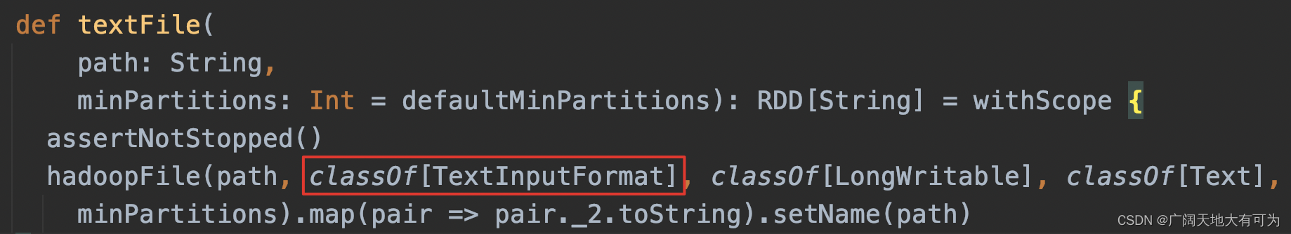 def hadoopFile[K, V](path: String,inputFormatClass: Class[_ <: InputFormat[K, V]],keyClass: Class[K],valueClass: Class[V],minPartitions: Int = defaultMinPartitions): RDD[(K, V)] = withScope {assertNotStopped()功能:读取HDFS文件或本地文件来创建RDD(使用MapReduce框架中InputFormat类)参数:path: 指定job的输入路径inputFormatClass: 对输入文件切片和读取的实现类keyClass: key的数据类型valueClass: value的数据类型minPartitions: 最小切片数