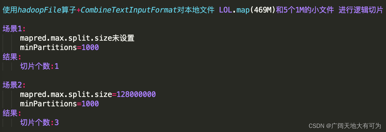 test("spark中使用 CombineTextInputFormat") {// 初始化 spark配置实例val sf: SparkConf = new SparkConf().setMaster("local[4]").setAppName("")// 初始化 spark环境对象val sc: SparkContext = new SparkContext(sf)// 读取目录下的所有文件val input = "src/main/resources/data/dir/dir3"val combineRDD: RDD[(LongWritable, Text)] = sc.hadoopFile[LongWritable, Text, org.apache.hadoop.mapred.lib.CombineTextInputFormat](input, 10000)// val combineRDD: RDD[(LongWritable, Text)] = sc.hadoopFile[LongWritable, Text// , org.apache.hadoop.mapred.TextInputFormat](input, 10000)sc.hadoopConfiguration.setInt("mapred.max.split.size", 128000000)//sc.hadoopConfiguration.setInt("mapreduce.input.fileinputformat.split.maxsize", 128000000)println("切片个数:" + combineRDD.getNumPartitions)//combineRDD.map(_._2.toString).foreach(println(_))//combineRDD.collect()//combineRDD.hadsc.stop()}