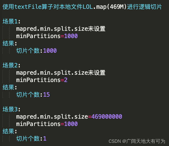 // 切片大小计算规则splitSize = Math.max(minSize, Math.min(goalSize, blockSize))// 参数说明1.minSizeset mapreduce.input.fileinputformat.split.minsize=256000000 或 set mapred.min.split.size=256000000默认值 minSize=1L2.goalSizegoalSize=所有文件大小总和/指定的切片个数3.blockSize本地目录32M|HDFS目录128M或256M(看hdfs文件块具体配置)// 需求 1.真实切片大小 < blockSizegoalSize=所有文件大小总和/指定的切片个数 < blockSize 即(创建rdd时调大切片个数)2.真实切片大小 > blockSizeset mapreduce.input.fileinputformat.split.minSize=大于blockSize值