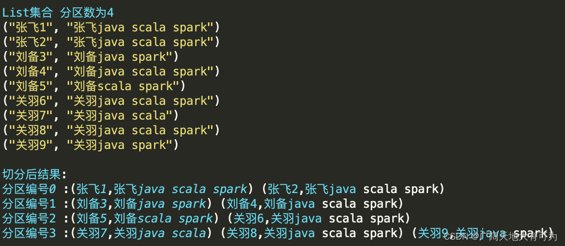 test("makeRDD - 切片逻辑") {// 初始化 spark配置实例val sparkconf: SparkConf = new SparkConf().setMaster("local[4]").setAppName("")// 初始化 spark环境对象val sc: SparkContext = new SparkContext(sparkconf)val rdd: RDD[(String, String)] = sc.makeRDD(List(("张飞1", "张飞java scala spark"), ("张飞2", "张飞java scala spark"), ("刘备3", "刘备java spark"), ("刘备4", "刘备java scala spark"), ("刘备5", "刘备scala spark"), ("关羽6", "关羽java scala spark"), ("关羽7", "关羽java scala"), ("关羽8", "关羽java scala spark"), ("关羽9", "关羽java spark")))// 查看每个分区的内容rdd.mapPartitionsWithIndex((i, iter) => {println(s"分区编号$i :${iter.mkString(" ")}");iter}).collect()rdd.getNumPartitionssc.stop()}