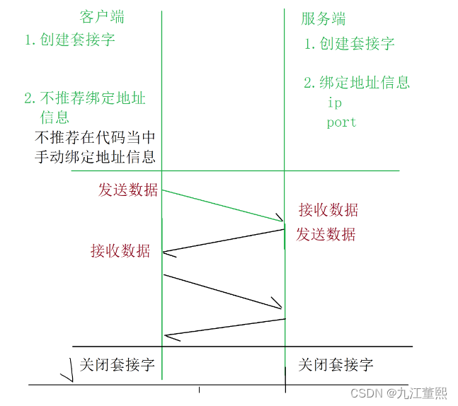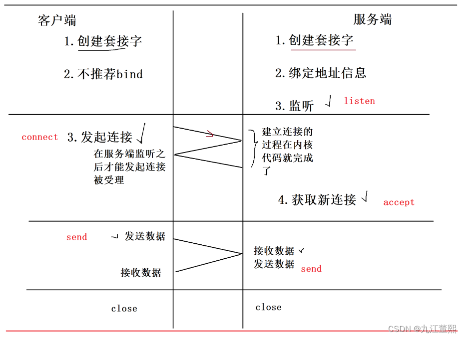 客户端: 创建套接字, 不推荐绑定地址信息 (可以绑定),发起连接,收发数据,关闭连接。