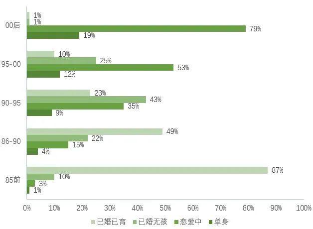 数据显示,79%的00后程序员已经脱单,在90-95年之间出生的程序员中,有66%的人处于恋爱或结婚状态。有一半年龄在35岁左右的程序员已经组建了美满的家庭,拥有妻子和孩子。