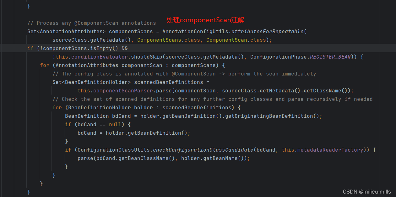 public void postProcessBeanDefinitionRegistry(BeanDefinitionRegistry registry) {int registryId = System.identityHashCode(registry);if (this.registriesPostProcessed.contains(registryId)) {throw new IllegalStateException("postProcessBeanDefinitionRegistry already called on this post-processor against " + registry);}if (this.factoriesPostProcessed.contains(registryId)) {throw new IllegalStateException("postProcessBeanFactory already called on this post-processor against " + registry);}this.registriesPostProcessed.add(registryId);processConfigBeanDefinitions(registry);}