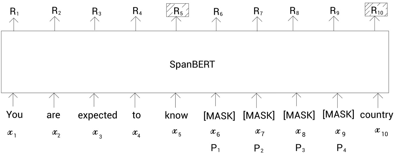 在SpanBERT中,不是对标记进行随机掩码,而是对连续片段进行掩码.
