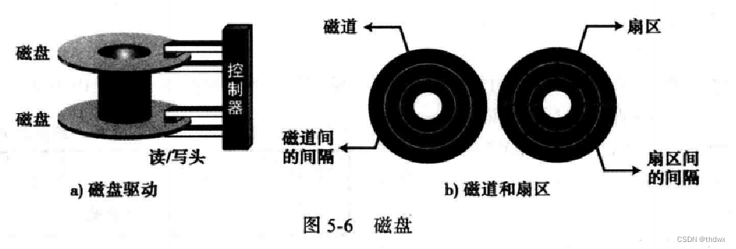 磁盘:磁盘由一张张地磁片叠加而成,这些磁片由薄磁膜封装起来。信息是通过磁头读写磁介质表面来进行存取的。