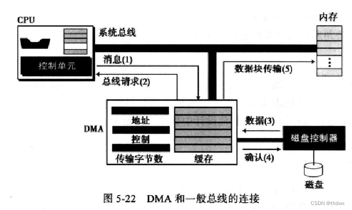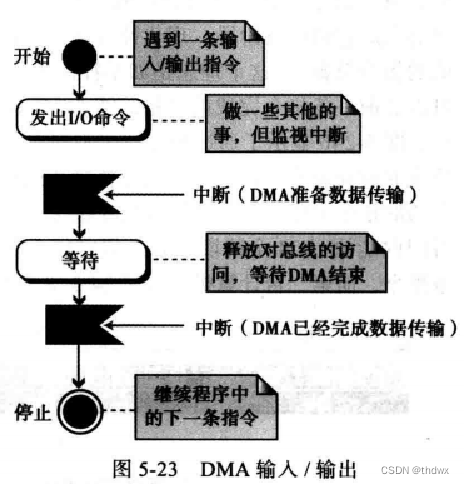 直接存储器存取(DMA):这种方法用于在高速I/O设备间传输大量数据块,DMA承担一部分CPU的功能。CPU首先发送消息给DMA。这些消息包括传输类型、内存单元的起始地址以及传输的字节数,之后CPU就可以做其他工作。当准备好传输数据时,DMA通知CPU它需要获得总线的使用权,CPU在这时候停止使用总线,等待传输完成。在这种方法中,CPU只有在数据传输时是空闲的,大大提高了CPU的性能。