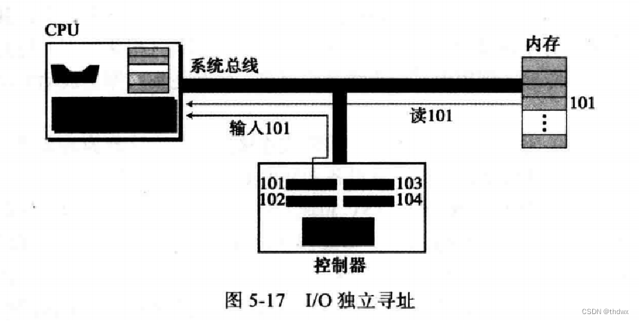 I/O独立寻址:用来存取内存的指令和存取输入输出设备的指令是不同的,所以输入输出设备可以和内存有相同的地址,根据指令就能分辨出来是在内存操作还是在输入输出设备操作。