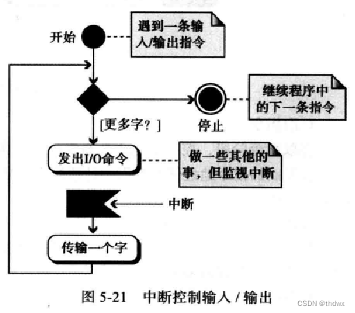 中断控制输入/输出:CPU先告知设备即将开始传输,然后就去做其他工作。当I/O设备准备好的时候,它通知(中断)CPU,开始传输任务。
