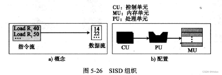 SISD组织(单指令流单数据流):计算机只有一个控制单元、一个算术逻辑单元、一个内存单元。指令被顺序执行,每条指令可以存取数据流中的一个或多个数据项。