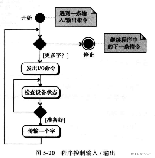 程序控制输入/输出:CPU等待I/O设备。当CPU遇到一条I/O指令时,它就停止工作直到数据传输完毕。CPU不停的查询I/O设备的状态:如果准备好了,数据就被传入CPU;如果没准备好,CPU就会一直查询直到设备准备好。这种方法的问题就是,CPU浪费了大量的时间去查询I/O设备的状态,降低了性能。