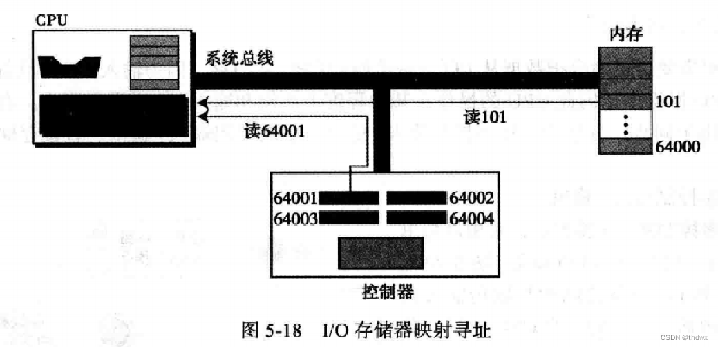 I/O存储器映射寻址:CPU用来存取输入输出设备和存取内存的指令是一样的,将输入输出设备的地址看作是内存中的地址,内存就不能再使用输入输出设备使用的地址,也就是说,内存大小减小了。