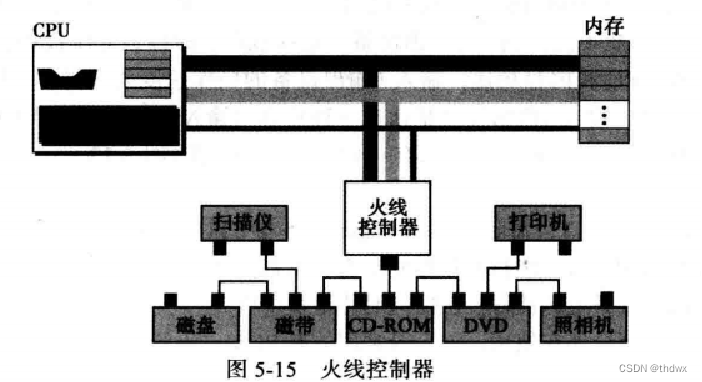 控制器:或者说接口,清除了输入/输出设备与CPU和内存在本质上的障碍。控制器可以是串行或并行的设备。串行只有一根线连接到设备上,并行则有多根线连接到设备上。如今最常用的控制器有:SCSI、火线、USB及HDMI。