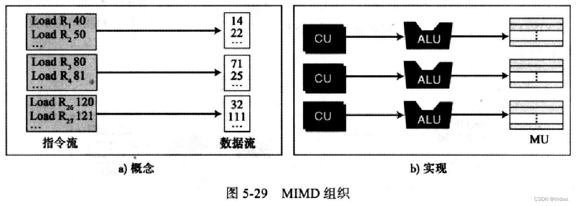 MIMD组织(多指令流多数据流):真正的并行处理体系结构,可同时执行多个任务。处理器从控制器接收不同的指令,对不同的数据进行操作。