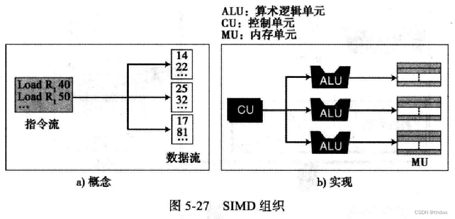SIMD组织(单指令流多数据流):计算机有单个控制单元、多个算术逻辑单元和一个内存单元。所有处理器单元从控制器接收相同的指令,但对不同的数据进行操作。