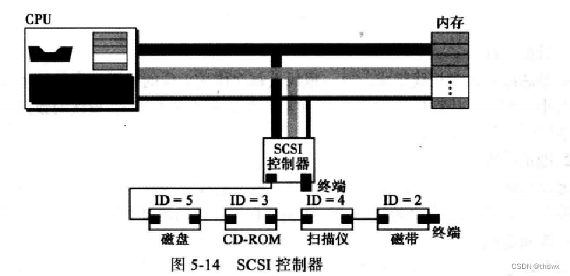 SCSI:小型计算机系统接口,是一个8、16或32线的并行接口。如图,它提供了菊花链连接,连接链的两端都必须有终结器,并且每个设备都必须有唯一的地址。