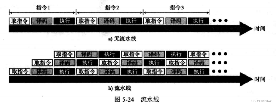 我们直到简化的机器周期有三个部分:取指令、译码和执行。在早期的计算机中,只有当上一条指令执行完成后,下一个机器周期才会开始。现代计算机使用流水线来改善吞吐量(单位时间内完成的指令总数)。这个理念是如果控制单元能够同时进行不同指令的不同阶段,那么运行效率就会大大增加。