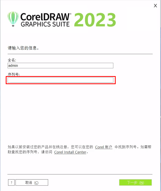 等待下载进度完成后,在以下界面中输入软件序列号。