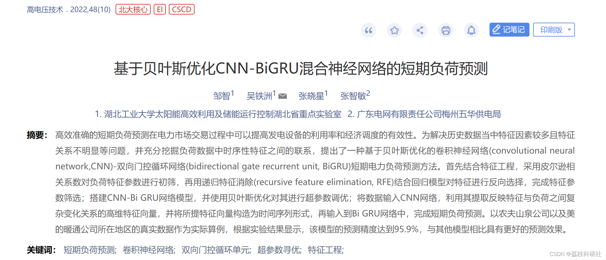 [1]邹智,吴铁洲,张晓星等.基于贝叶斯优化CNN-BiGRU混合神经网络的短期负荷预测[J].高电压技术,2022,48(10):3935-3945.DOI:10.13336/j.1003-6520.hve.20220168.