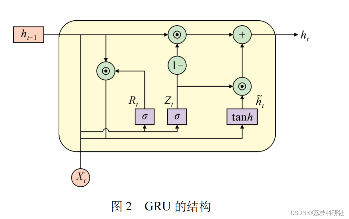 炸几乎不可避免,从而导致 RNN 将很难从长距离序列中捕捉到有效信息[35]。LSTM 作为一种特殊的RNN,其提出很好地解决了 RNN 中梯度消失的问题[36]。而 GRU 则是在 LSTM 的基础上提出,其结 构更简单,参数更少,训练时间短,训练速度也比更快[37]。GRU 结构图如图 2 所示。