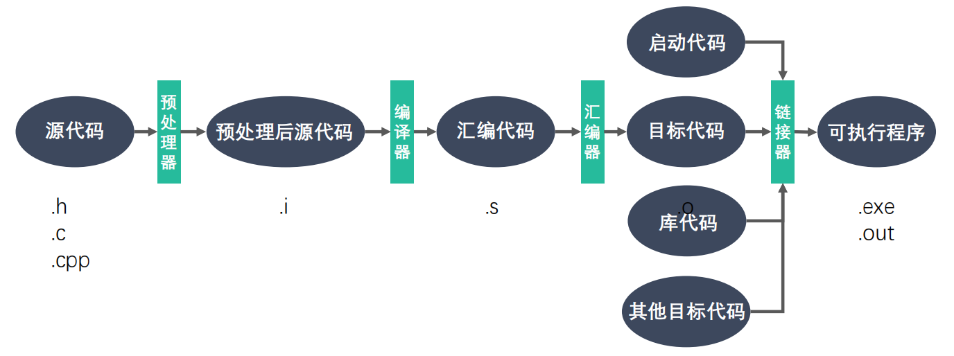 gcc 编译器从拿到一个c 源文件到生成一个可执行程序,中间一共经历了四个步骤: