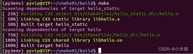 SET(LIBHELLO_SRC hello.cpp) ADD_LIBRARY(hello_static STATIC ${LIBHELLO_SRC}) //对hello_static的重名为hello SET_TARGET_PROPERTIES(hello_static PROPERTIES OUTPUT_NAME "hello") //cmake在构建一个新的target时会尝试清理掉其他使用这个名字的库因为在构建libhello.so时,就会清理掉libhello.a SET_TARGET_PROPERTIES(hello_static PROPERTIES CLEAN_DIRECT_OUTPUT 1)ADD_LIBRARY(hello SHARED ${LIBHELLO_SRC}) SET_TARGET_PROPERTIES(hello PROPERTIES OUTPUT_NAME "hello") SET_TARGET_PROPERTIES(hello PROPERTIES CLEAN_DIRECT_OUTPUT 1)