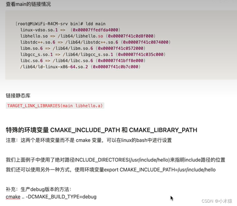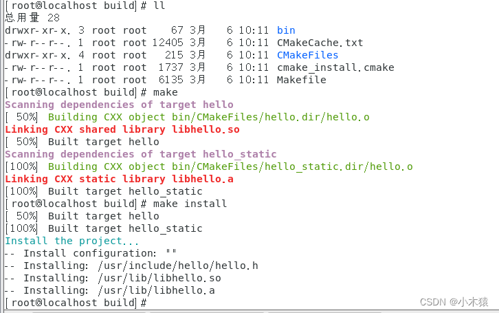 /include/hello目录 //文件放在该目录下 INSTALL(FILES hello.h DESTINATION include/hello) //二进制,静态库动态库安装都用TARGETS //ARCHIVE 特指静态库,LIBRARY特指动态库,RUNTIME特指可执行目标二进制 INSTALL(TARGETS hello hello_static LIBRARY DESTINATION lib ARCHIVE DESTINATION lib)指定cmake -D CMAKE_INSTALL_PREFIX=/usr ..
