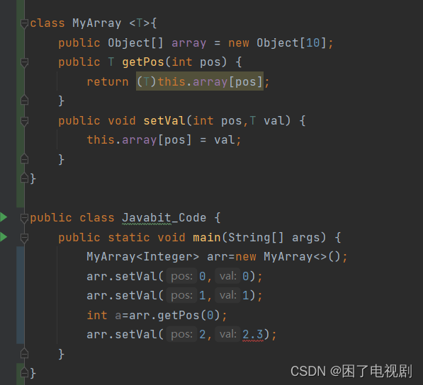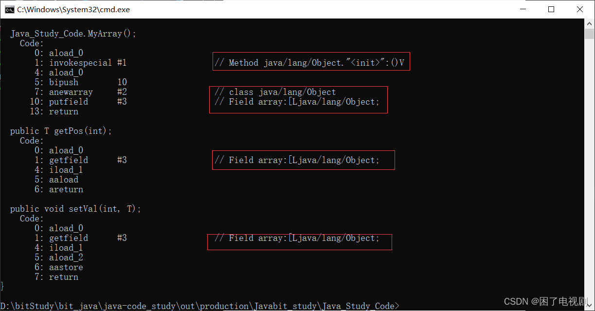 我们通过valueof的源码可知,当i>low并且 对于这段代码我们打开反编译看一下他底层的运行机制。 现在我定义了一个泛型类MyArray,其中T就是需要传入的类型。在我的main函数中,我用Integer当做我现在传入的类型,实例化了一个MyArray类。 由上图我们可以发现两点: 2.获取元素的时候,可以帮助我们进行类型转换。 我们在了解到泛型的用处后自然需要知道泛型的底层是如何运行的,我们打开命令行观察一下反编译: 通过这个我们可以看到在改程序运行的时候,参与的并不是我们的T类型(在本例中则是Integer类型)而是Object类型,这就是泛型的擦除机制。 即在编译的时候,泛型起到的作用是帮我们进行修正,如果我们输入了不符合相应类型的数据,则会在编译的时候报错来提醒我们,而当我们输入的全部数据都合规并且通过编译的时候,程序在运行的过程中就会“擦除”这些泛型,统一用Object类进行运算,这就是泛型的擦除机制。 以这段代码为例,这段代码能通过编译,但是在运行的时候会报错。 数组在java中是一个很特殊的东西,在这段代码中getArray的返回数组在运行时被擦除成一个Object数组,此时java并不知道这个数组中的元素是否均满足要求,所以尽管我们的数据可能都是合法的,但是java认为这些数据中可能会有其他类型,于是出于安全性的考量不会让我们进行运行。 以上就是本篇博客的全部内容,如有疏漏还请指出。拆箱