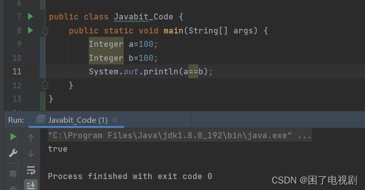 我们都知道,对于引用类型来说,==比较的是两个引用类型的地址而不是值,要想比较值的大小,需要重写equals方法才行,那么问题来了,此时的a和b都是包装类,是引用类型,这里应该比较的是地址,按常理来说应该是false才对,然而结果确实true,我们再来看一个栗子: