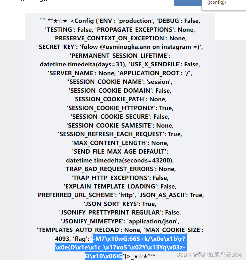 这里为何访问{{config}}那是因为,app.config['flag'] = encode('', 'GQIS5EmzfZA1Ci8NslaoMxPXqrvFB7hYOkbg9y20W3', 'xwdFqMck1vA0pl7B8WO3DrGLma4sZ2Y6ouCPEHSQVT') config的赋值
