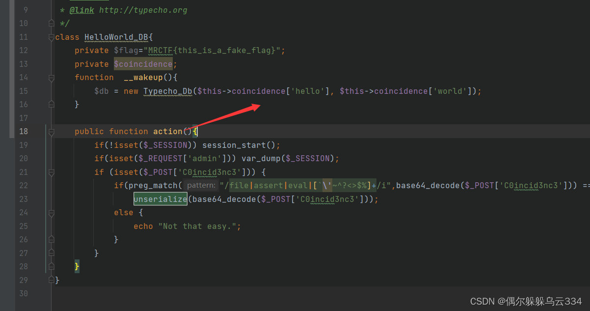coincidence['hello'], $this->coincidence['world']);}public function action(){if(!isset($_SESSION)) session_start();if(isset($_REQUEST['admin'])) var_dump($_SESSION);if (isset($_POST['C0incid3nc3'])) {if(preg_match("/file|assert|eval|[`\'~^?<>$%]+/i",base64_decode($_POST['C0incid3nc3'])) === 0)unserialize(base64_decode($_POST['C0incid3nc3']));else {echo "Not that easy.";}}}