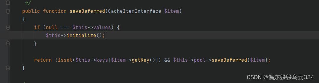 这里的this->pool是我们可以控制的,所以找出一个恶意类中的 saveDeferred方法即可,最终找到了PhpArrayAdapter.php中的方法,