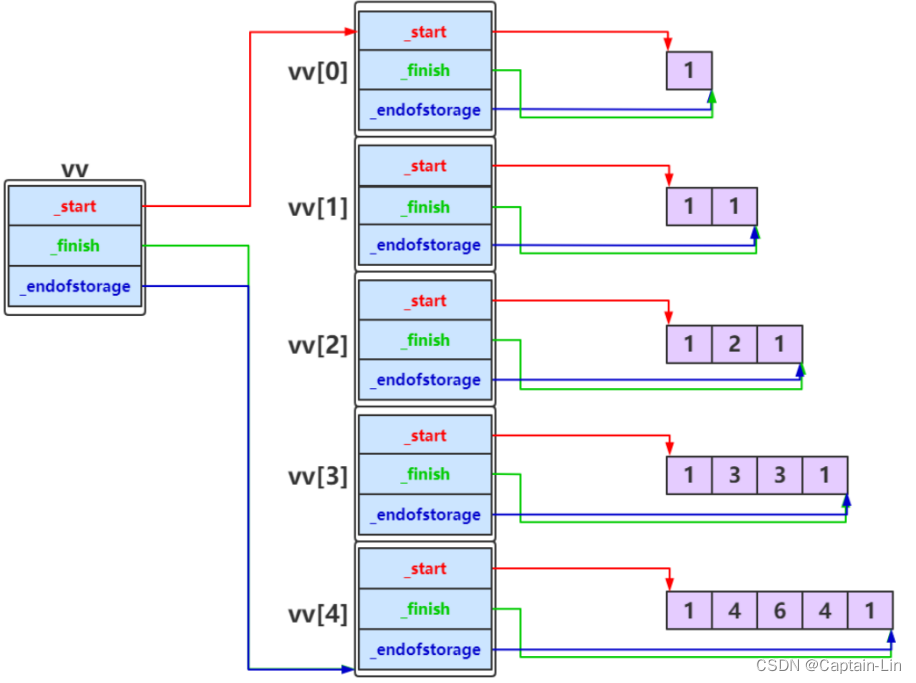 使用标准库中vector构建动态二维数组时与上图实际是一致的。
