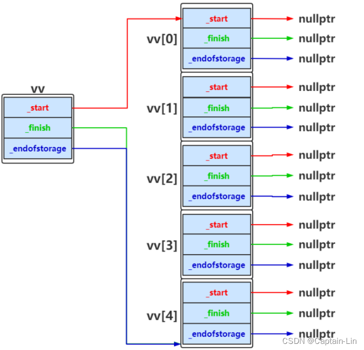 上述代码构造一个vv动态二维数组,vv中总共有n个元素,每个元素都是vector类型的,每行没有包含任何元素,如果n为5时如下所示: