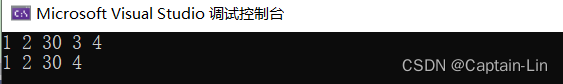 {// 使用列表方式初始化,C++11新语法vector v{ 1, 2, 3, 4 };// 在指定位置前插入值为val的元素,比如:3之前插入30,如果没有则不插入// 1. 先使用find查找3所在位置// 注意:vector没有提供find方法,如果要查找只能使用STL提供的全局findauto pos = find(v.begin(), v.end(), 3);if (pos != v.end()){// 2. 在pos位置之前插入30v.insert(pos, 30);}vector::iterator it = v.begin();while (it != v.end()){cout << *it << " ";++it;}cout << endl;pos = find(v.begin(), v.end(), 3);// 删除pos位置的数据v.erase(pos);it = v.begin();while (it != v.end()) {cout << *it << " ";++it;}cout << endl;