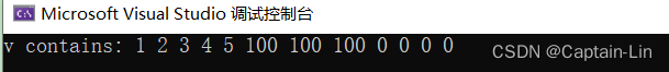{vector v;// set some initial content:for (int i = 1; i < 10; i++)v.push_back(i);v.resize(5);//size由10->5,6~10的size被释放v.resize(8, 100);//size由5->8,6~8的size被初始化为100v.resize(12);//size由8->12,9~12的size被默认初始化为0cout << "v contains:";for (size_t i = 0; i < v.size(); i++)cout << ' ' << v[i];cout << '\n';