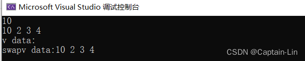 {vector v{ 1, 2, 3, 4 };// 通过[]读写第0个位置。v[0] = 10;cout << v[0] << endl;// 1. 使用for+[]小标方式遍历for (size_t i = 0; i < v.size(); ++i)cout << v[i] << " ";cout << endl;vector swapv;swapv.swap(v);//通过上面的代码swapv.swap(v),已经将数组v的数据转移到swapv上了cout << "v data:";for (size_t i = 0; i < v.size(); ++i)cout << v[i] << " ";cout << endl;// 2. 使用迭代器遍历cout << "swapv data:";auto it = swapv.begin();while (it != swapv.end()){cout << *it << " ";++it;}// 3. 使用范围for遍历for (auto x : v)cout << x << " ";cout << endl;
