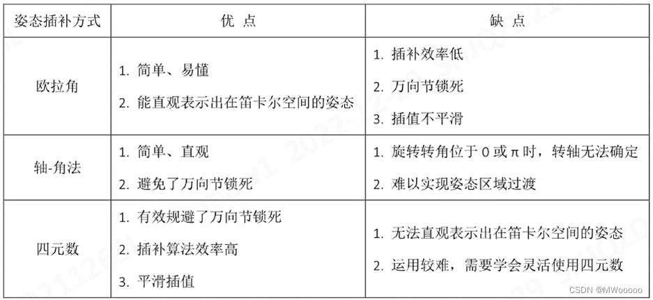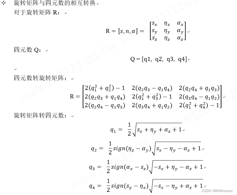 本文总结了用于机器人姿态规划的常见三种姿态规划方法,包括:欧拉角、角轴以及四元数。三种方法各有优劣,根据使用场景自由选择。