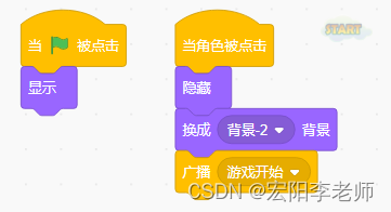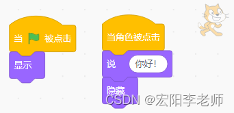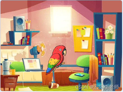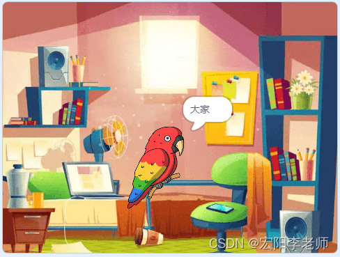 1)点击绿旗,角色、背景如图所示;
