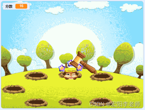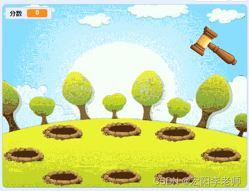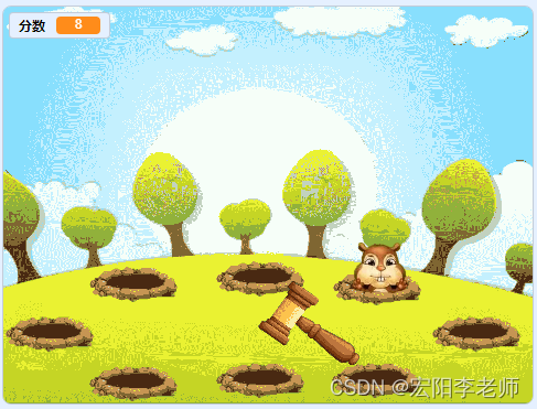 通过鼠标控制锤子移动,在出现地鼠的地洞处点击锤子,被锤子砸中的地鼠出现眩晕后消失。