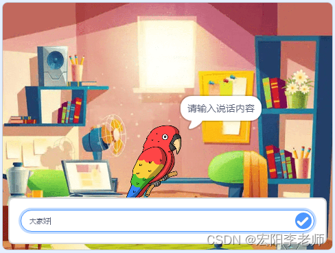 2)按下一次空格键,鹦鹉询问:“请输入说话内容”同时出现询问框;