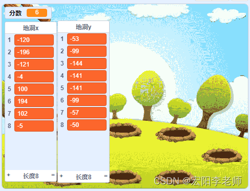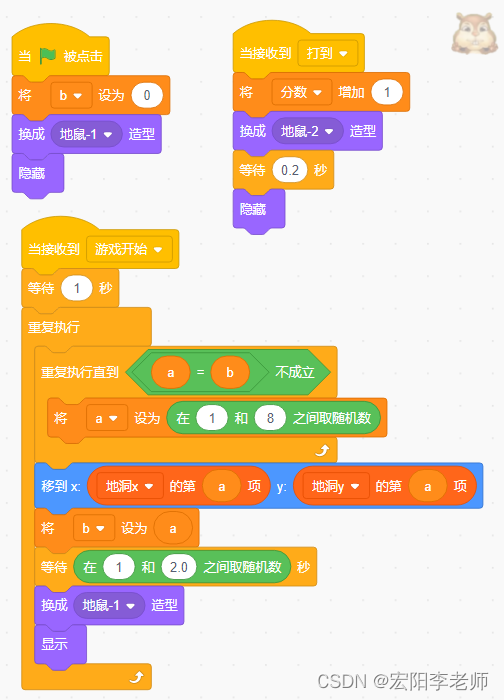 5)地鼠如果被锤子砸中,此时地鼠切换造型0.2秒,当它消失后分数+1;